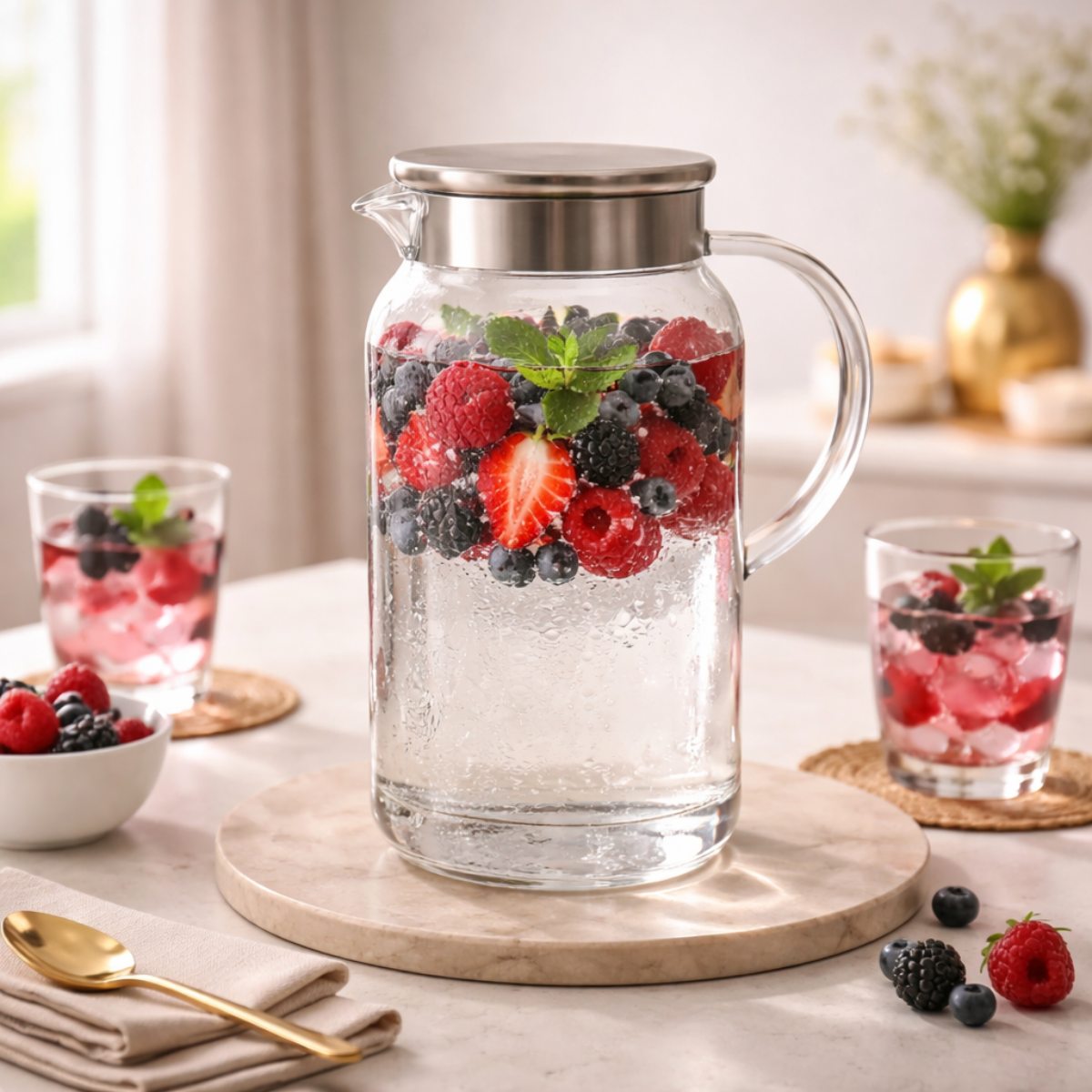 Jarra de vidro com tampa de inox ideal para servir água, sucos, chás gelados e outras bebidas com praticidade e elegância. Possui capacidade de 1,8 litros, sendo perfeita para uso diário em cozinhas, mesas de jantar, escritórios e eventos.