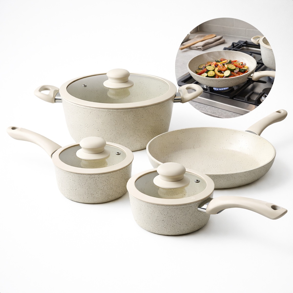 O revestimento cerâmico antiaderente facilita o preparo dos alimentos utilizando menos óleo, além de não liberar resíduos tóxicos. As panelas acompanham tampas de vidro temperado com borda em silicone, que permitem acompanhar o cozimento sem precisar abrir a panela, evitando perda de calor.